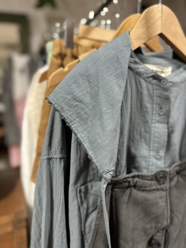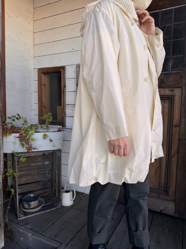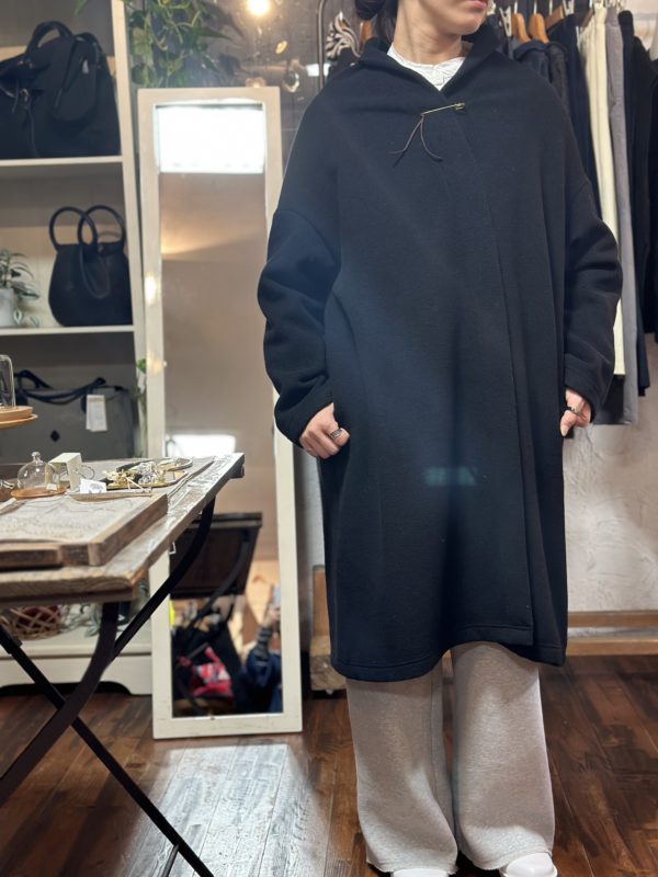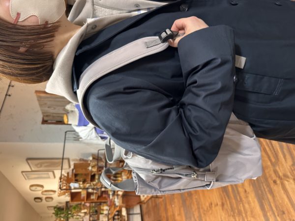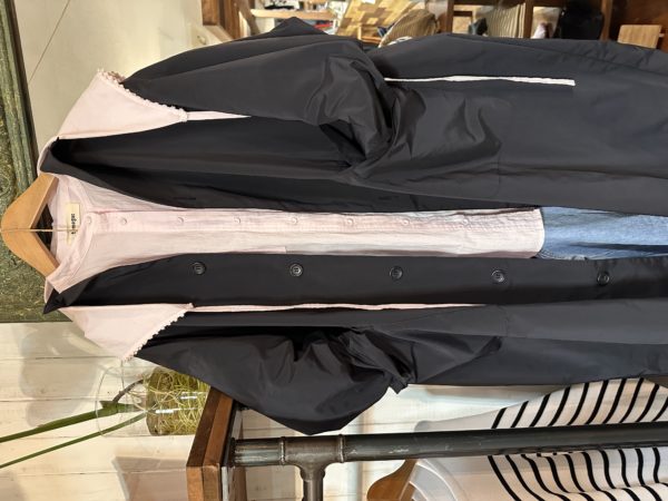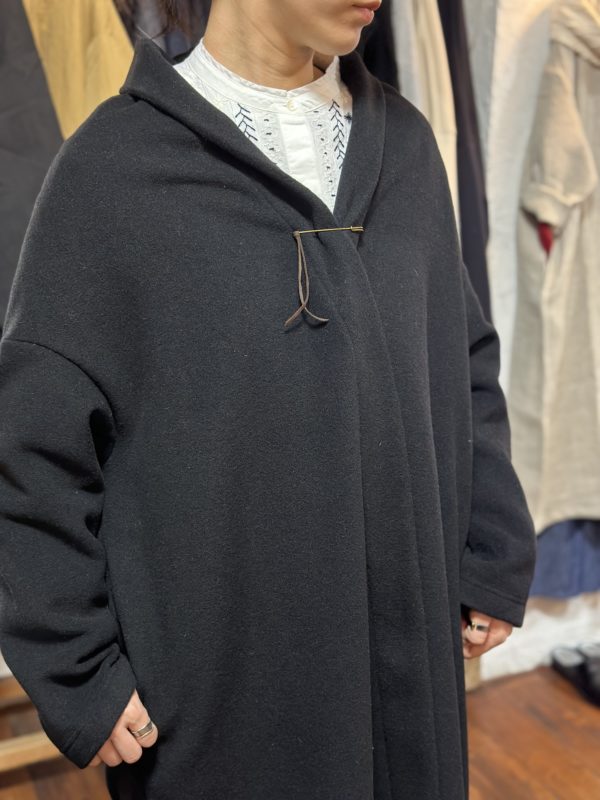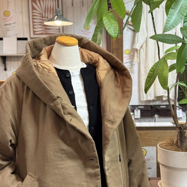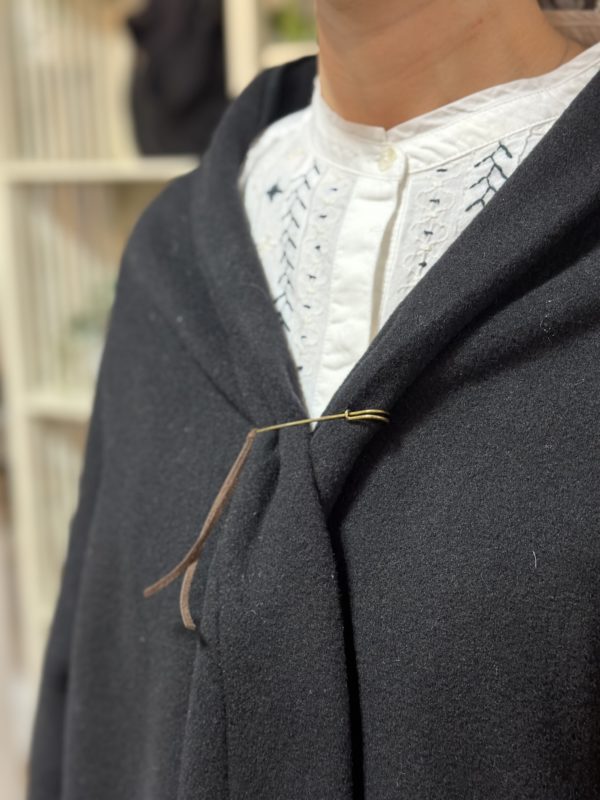 付属のピンが付いているので、止める場所によって色んな表情になるコートです。