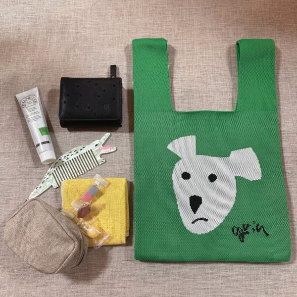 おすまし顔のワンちゃんバッグ。